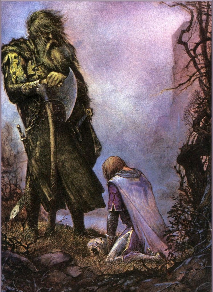 At the beginning of Sir Gawain’s story the Green Knight is introduced and he offers a game to Arthur and the Knights of the Round Table. King Arthur’s company responds to his proposition with silence, intimidated by the Green Knight’s size and shade and respectful of their lord Arthur. It is only after Arthur himself responds to the knight that Gawain gathers the courage to meet the green man’s request. Because of his great love and respect for his lord, Gawain overcomes his initial dread and asks that Arthur allow him to take the task. This is key to the ideals presented in this tale, and representative of what makes Sir Gawain a hero.
